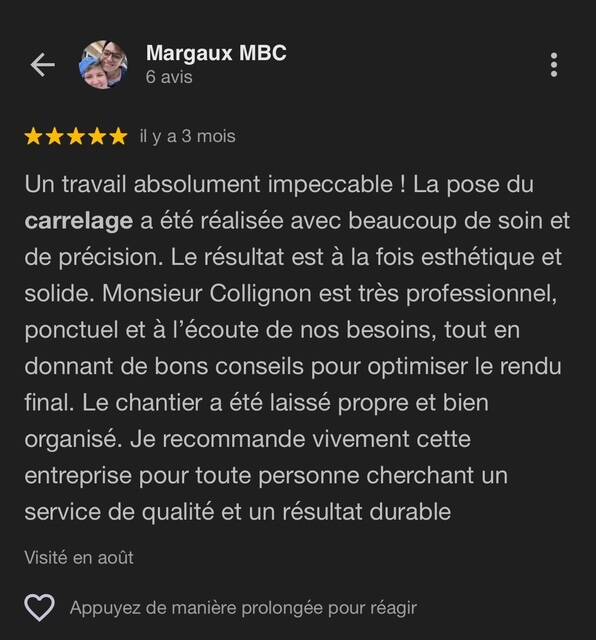Collignon.C est une entreprise spécialisée dans les travaux de finition intérieure, dans le Grand Est. Avec des années d'expérience, nous mettons notre savoir-faire au service de vos projets, qu'il s'agisse de faïence, de carrelage, de mosaïque ou de parquet et petits travaux de maçonnerie ainsi que placo, chappe, ragréage. Mon objectif est de sublimer chaque intérieur avec des travaux de qualité, réalisés dans les règles de l'art. Nous privilégions une approche personnalisée pour chaque client, garantissant des résultats qui répondent parfaitement à leurs attentes. Chez Collignon.C, votre satisfaction est ma priorité.